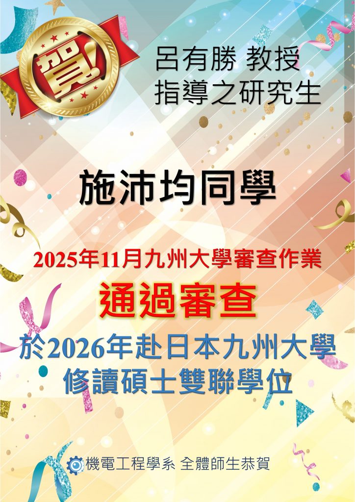 2025-11-14 賀! 本系呂有勝教授2025年指導學生施沛均 九州大學審查作業通過 將於2026年赴日本九州大學修讀碩士雙聯學位 Post author:Eric Post published:2025-11-14