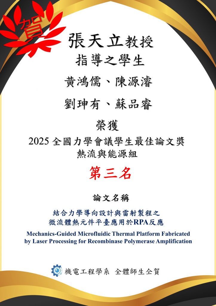 2025-12-24 賀! 本系張天立教授2025年指導學生黄鴻儒、陳源濬、劉珅有、蘇品睿,榮獲2025 全國力學會議 學生最佳論文獎熱流與能源組 第三名 (名稱:結合力學導向設計與雷射製程之微流體熱元件平臺應用於RPA反應 Mechanics-Guided Microfluidic Thermal Platform Fabricated by Laser Processing for Recombinase Polymerase Amplification)